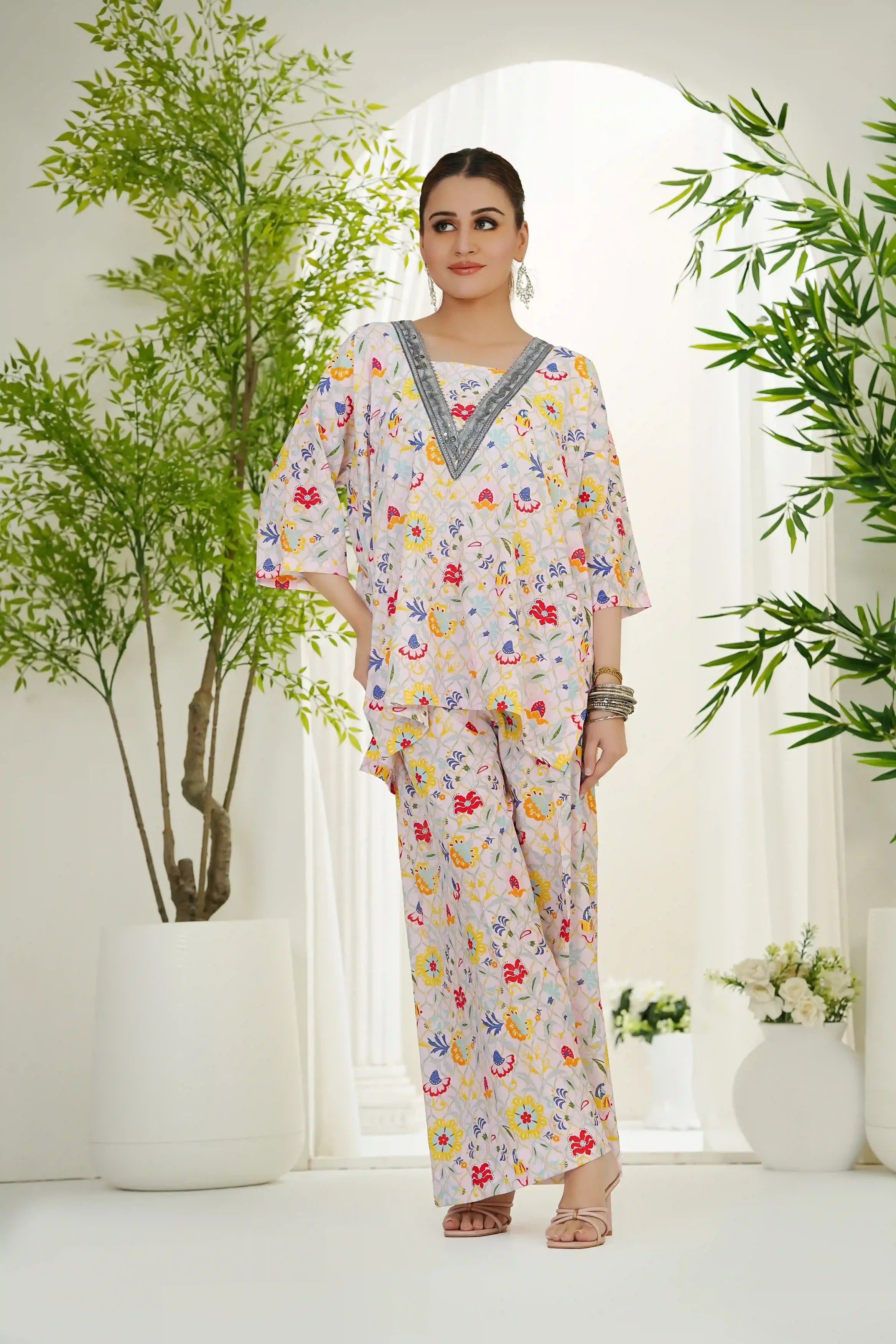 Elevate your summer wardrobe with this breezy 2-piece Swiss lawn set, featuring a charming floral print in vibrant hues. The loose-fit shirt and straight pants ensure all-day comfort while exuding effortless elegance. Intricate lace detailing on the neckline adds a graceful touch. 🌸
