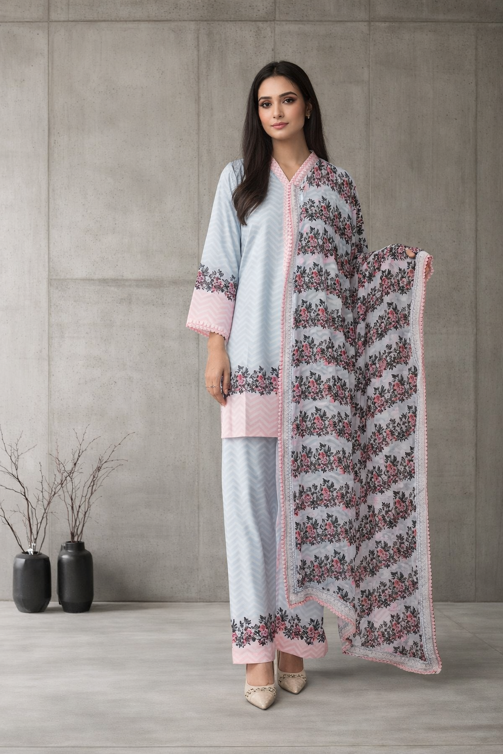 This charming 3-piece Swiss lawn suit features a serene sky blue base with subtle chevron patterns, beautifully complemented by delicate pink accents and floral borders. The matching printed dupatta showcases a vibrant floral design, adding a touch of elegance. This ensemble is perfect for a fresh and graceful look. 🌸