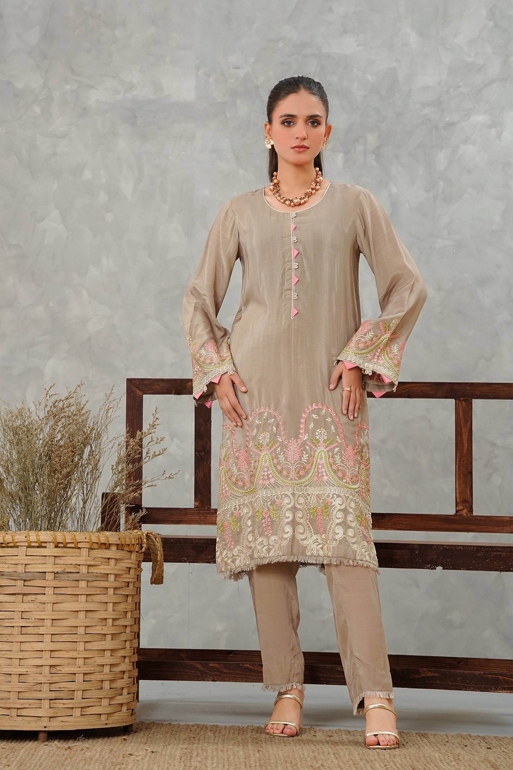 Discover understated elegance with our "Caramel Whispers" two-piece ensemble, crafted from luxurious raw silk in a rich camel hue. This beautifully designed dress features exquisite machine embroidery that adds a delicate touch of artistry. The flowing fabric and intricate detailing combine to create a sophisticated and effortlessly chic look, perfect for a refined daytime event or an evening gathering. 🕊️