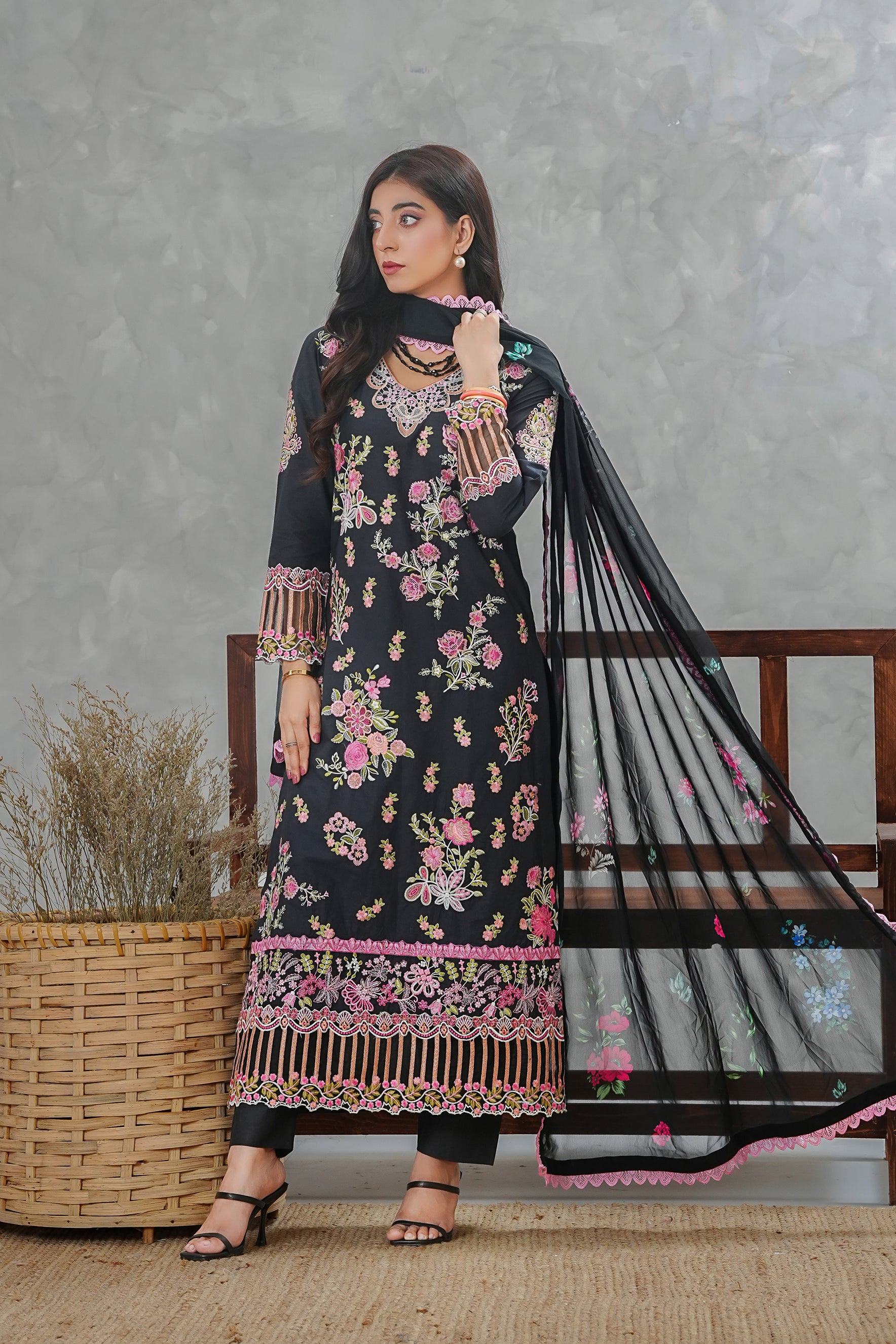 Embrace the elegance of the "Floral Tapestry" ensemble, featuring a fully embroidered cotton lawn shirt blooming with vibrant floral designs. This intricate top is beautifully paired with simple, complementary trousers, creating a balanced and sophisticated look. A graceful chiffon printed dupatta, adorned with delicate laces, adds a touch of ethereal charm, perfect for any special occasion. πΈ
