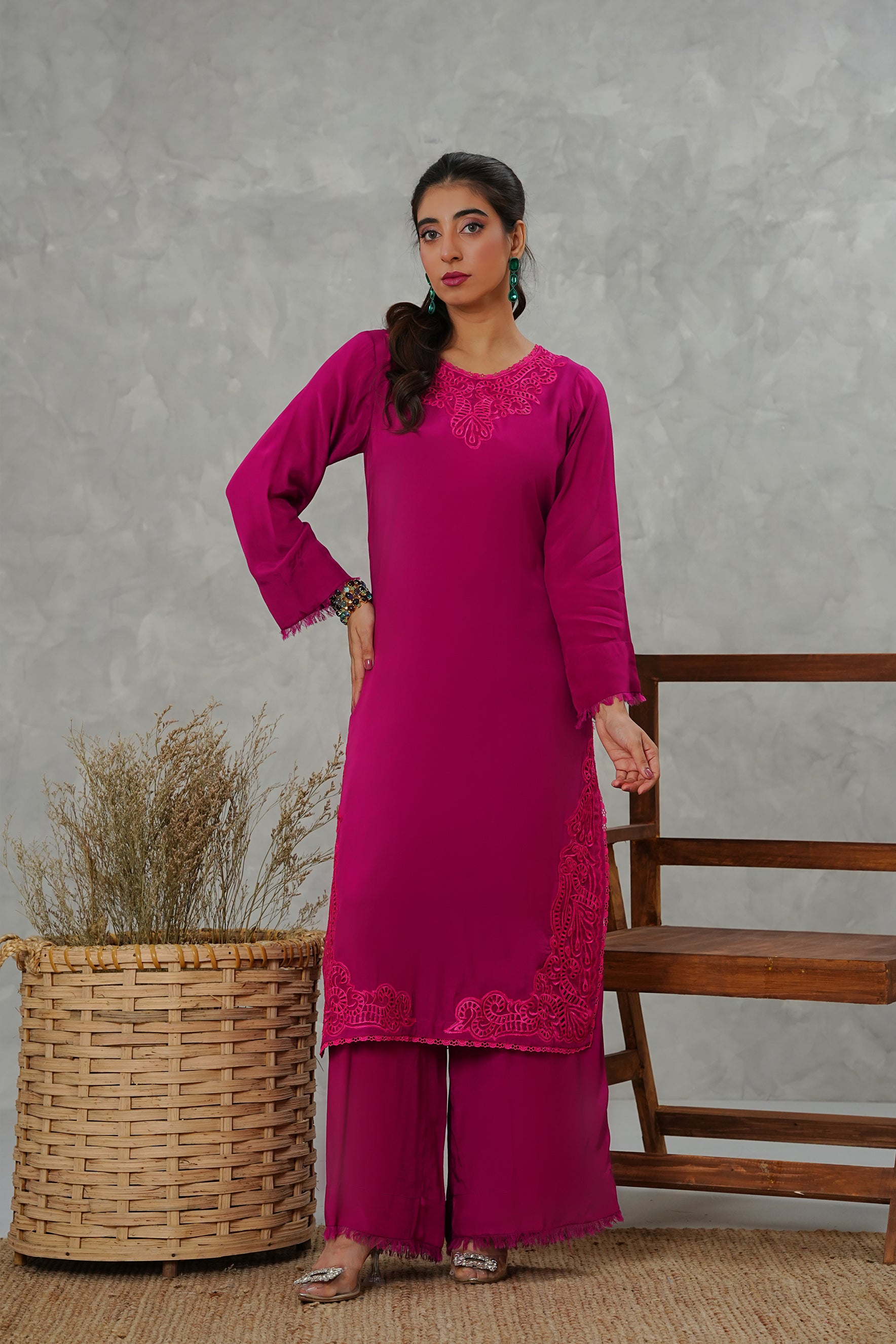 Radiate vibrant elegance in our "Fuchsia Bloom" two-piece ensemble, crafted from luxurious raw silk. This striking outfit is adorned with exquisite machine embroidery along the neckline and side seams (chaakline), adding a touch of sophisticated artistry. The rich fuchsia hue and elegant detailing combine to create a statement look that is both bold and beautiful, perfect for making a memorable impression. 🌸