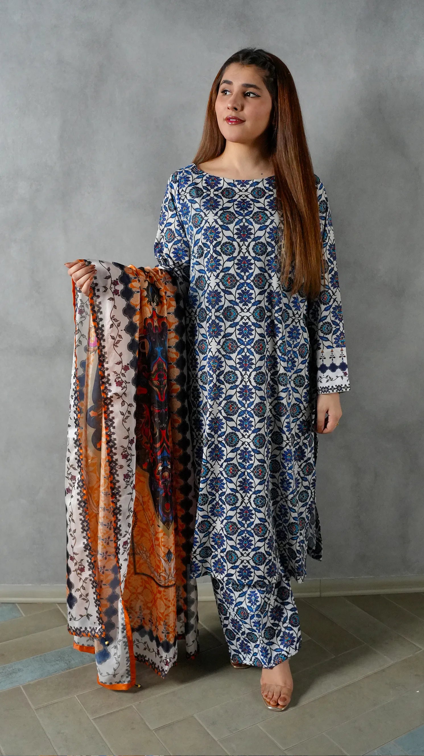 A true reflection of timeless grace, Lira is a stitched 3-piece ensemble designed for the modern woman who cherishes classic beauty. Made from soft and breathable crepe lawn, this outfit showcases intricate floral patterns in elegant blue tones, creating a perfect harmony of tradition and trend. The ensemble is paired with a statement silk dupatta, adorned in vibrant orange and artistic motifs, adding a lively contrast that turns heads effortlessly. Whether it’s a casual day out or a semi-formal gathering, Lira wraps you in comfort and sophistication with every wear.🌸💙