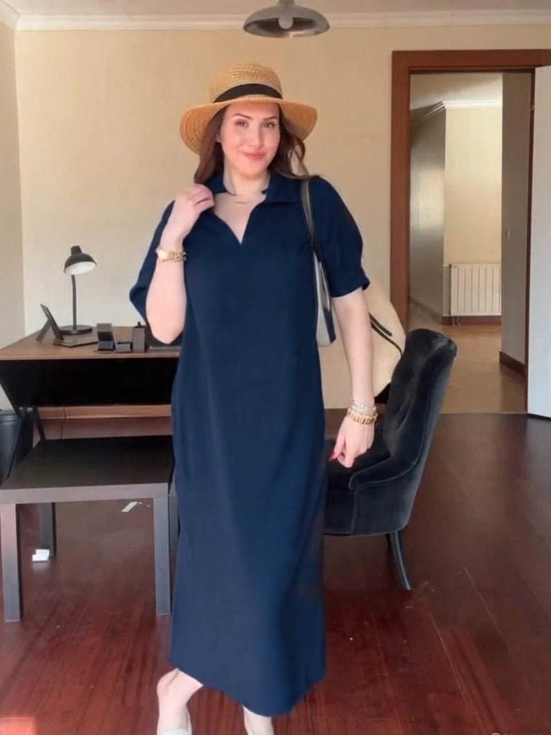 The Midnight Kaftan Dress is a classic and versatile piece that offers a luxurious feel. Its deep navy hue exudes sophistication, making it a perfect choice for both casual and elevated looks. The flowing, oversized fit and midi length provide exceptional comfort, while the subtle V-neckline and dolman sleeves create a graceful and flattering silhouette. This dress can be effortlessly styled with white sneakers and a baseball cap for a sporty, modern aesthetic or with sandals and a straw hat for a relaxed, vacation-ready ensemble.