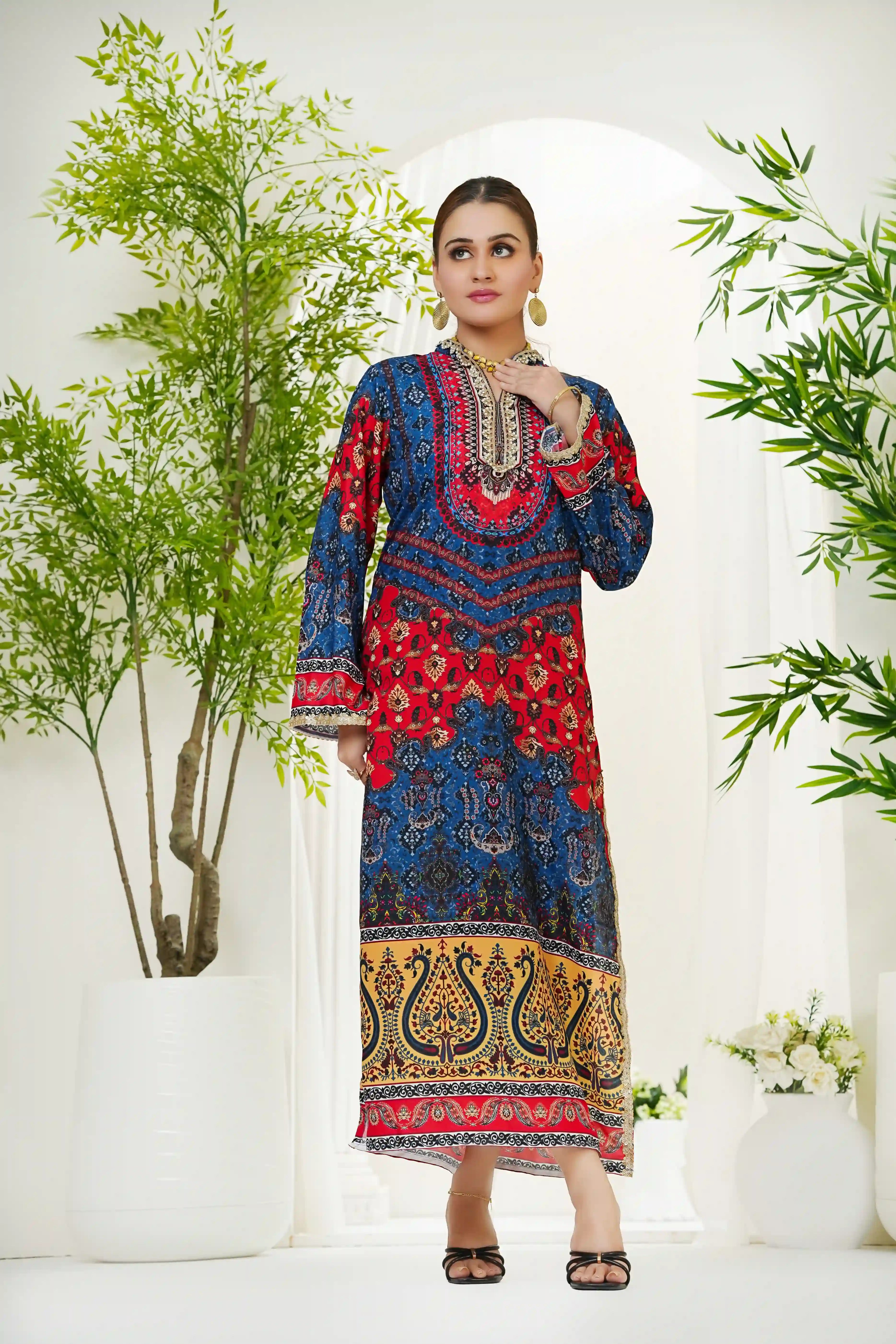 This stunning 1-piece Swiss lawn kaftan features a captivating blend of royal blue and vibrant red, adorned with intricate paisley and floral patterns. The design is beautifully highlighted by a contrasting mustard yellow border with detailed motifs at the hem. This elegant kaftan offers a comfortable yet sophisticated silhouette, perfect for making a statement.👑