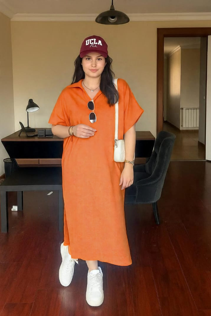 Embrace the warmth of the sun in the Saffron Sunset Kaftan Dress. This stunning one-piece features a rich, vibrant saffron orange color that brings a bold yet sophisticated feel to any look. The relaxed, kaftan silhouette offers a comfortable fit and a beautiful drape, while the midi length and side slits add a touch of modern elegance. Perfect for a variety of occasions, this dress can be dressed up with a sun hat and sandals for a resort-ready style or paired with sneakers and a baseball cap for a cool, casual vibe.